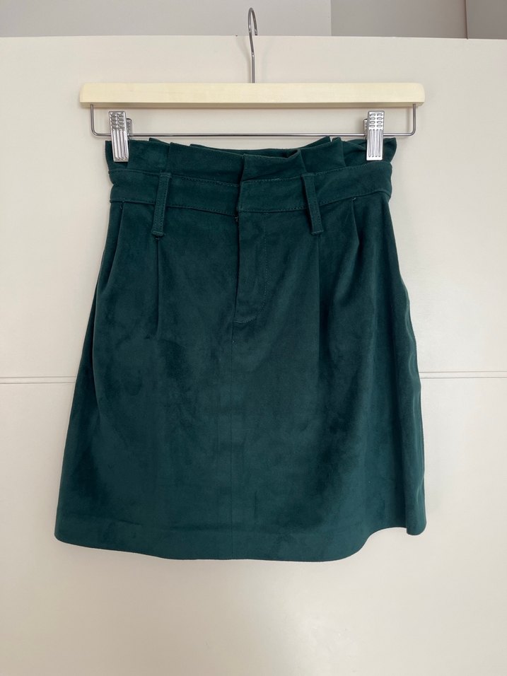 Kemer detaylı, koyu yeşil süet mini etek, ofis için uygun, minimal ve şık sokak stili görünümüne sahip.