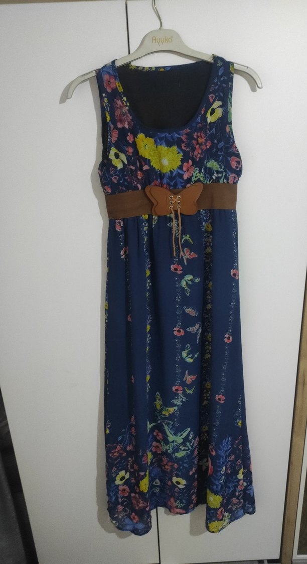 Kemer detaylı, halter yaka ve salaş kesim lacivert uzun elbise. Kolsuz, koyu renkli çiçekli tie-dye desene sahip, bohem tarzı için uygun.