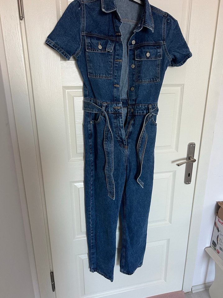 Trendyol Kemer detaylı, kısa kollu, yakalı lacivert denim tulum, günlük kullanıma uygundur. Trendy ve rahat bir stile sahiptir.