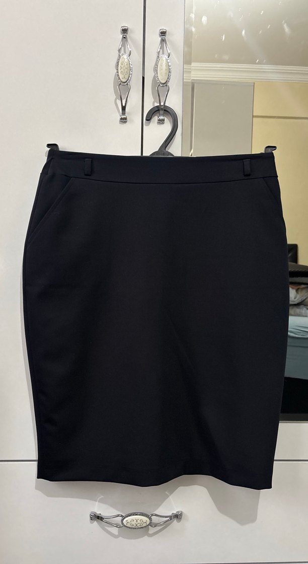 Ofis için uygun, kemer detaylı, lacivert diz üstü kalem etek,