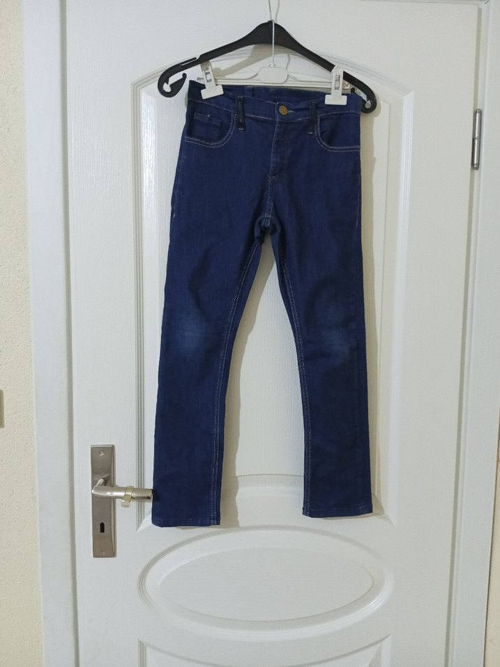 Erkek çocuklar için lacivert kot pantolon, kemer detaylı ve rahat kesimlidir. Sade ve trend bir stil sunar. not arkasında dört parmak yırtık tamiri vardır onun dışında bir sorunu yoktur