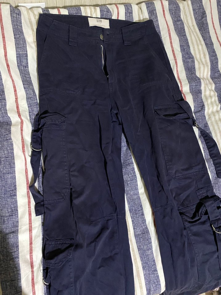 Kemerli, fitted kesimde lacivert denim pantolon. Sokak stiline uygun, günlük ve dış mekan kullanımı için ideal.