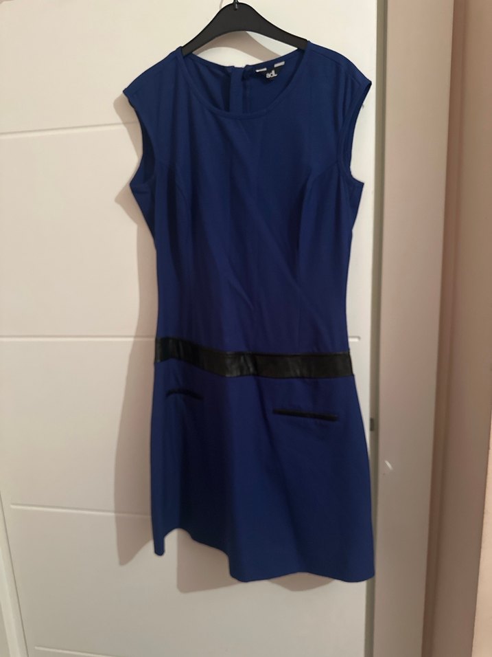 Kemer detaylı, V yakalı, kolsuz lacivert midi elbise, ofis için uygun minimal ve şık tasarım.