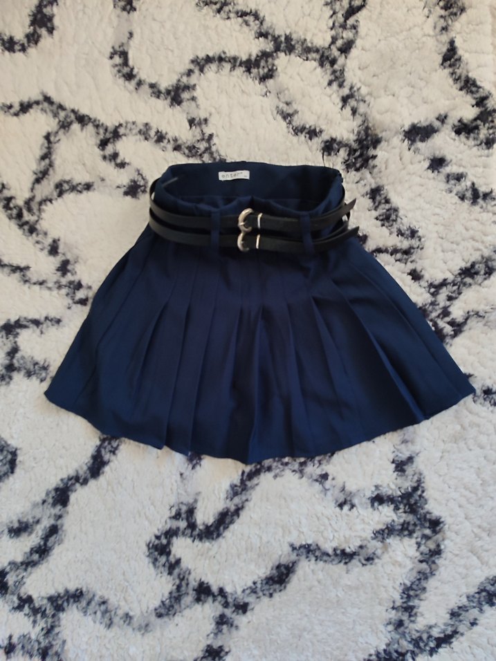 Lacivert mini etek, çift tokalı kemer detaylı içi şortlu, yüksek bel.