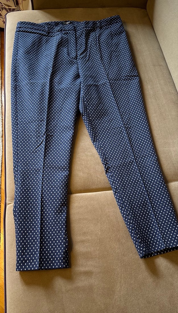 Kemer detaylı, lacivert puantiyeli kadın pantolon. Sentetik kumaştan, günlük kullanıma uygun, trend sokak stili için ideal.