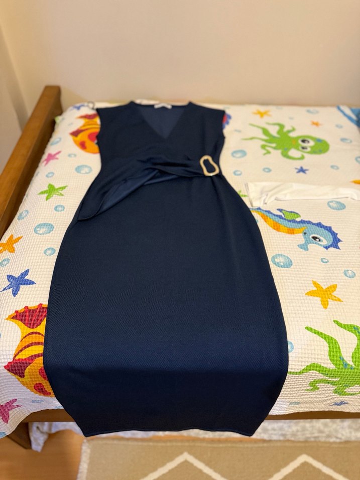 Kemer detaylı, V yakalı ve kolsuz, vücuda oturan lacivert uzun elbise. Ofis için uygun, şık ve sade desenli. S beden Ürün etiketli ve sıfırdır
