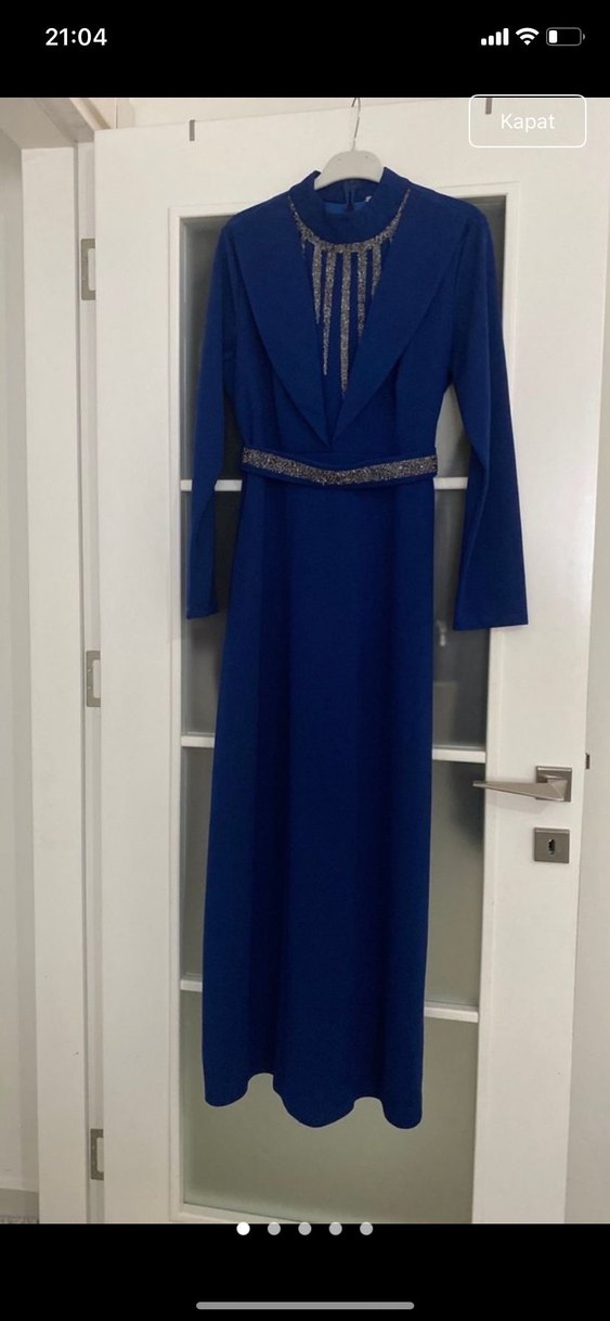 Bu uzun lacivert kadın elbise, kesikli yaka, uzun kollu ve kemer detaylıdır. Modern klasik tarzda, klasik şıklık sunar.