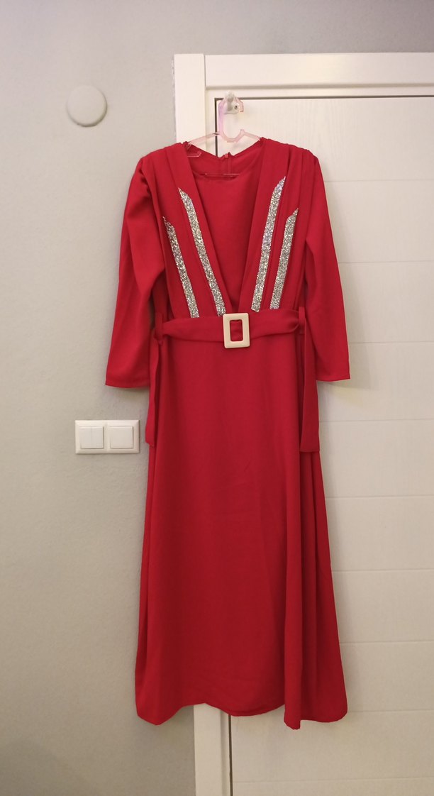 Kemer detaylı, bisiklet yakalı pembe uzun elbise, yumuşak sentetik kumaştan üretilmiştir. Düğünler için klasik ve rahat kesim. kemerin ucundaki taşi düşmüş ama ben yapistiripta göndericem renk kırmızı olarak görünüyor ama aslında şeker pembesi bir rengi vardır