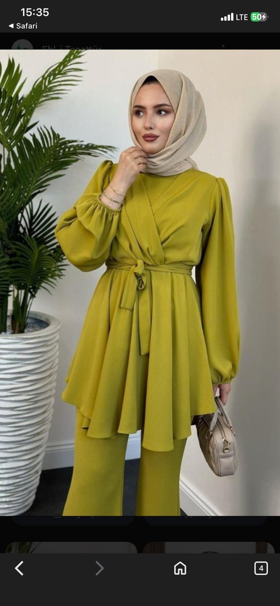 Kemerli, salaş kesim, uzun boy ve yüksek yakalı kadın takımı. Uzun kollu, sentetik kumaştan, açık haki renkte, sade ve günlük kullanıma uygun. Bir kez giyebildim sadece çok şık bir takım
