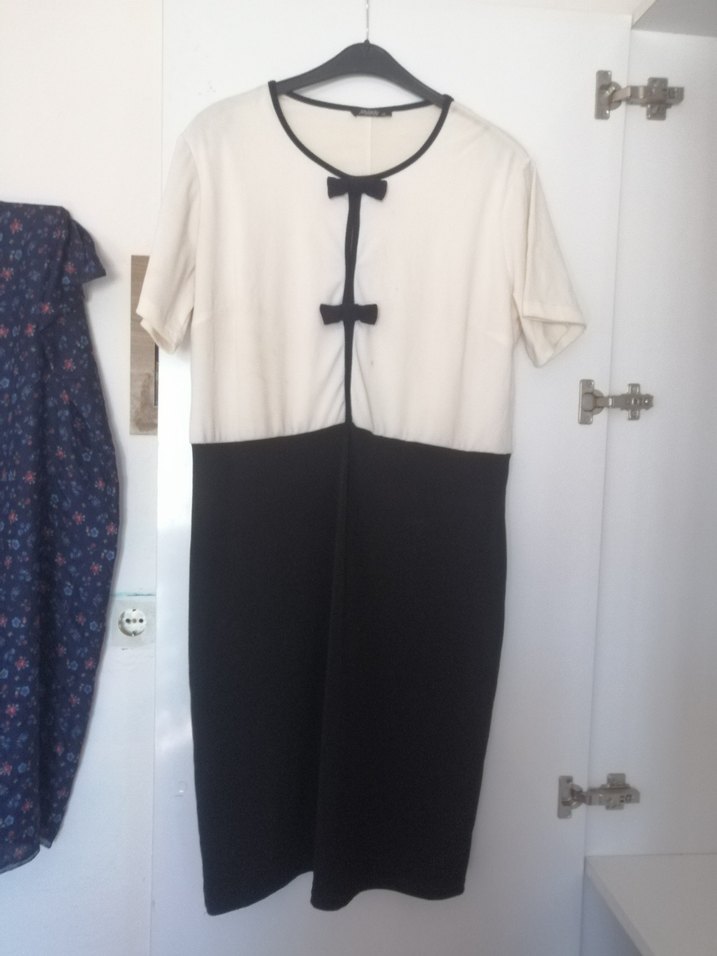 Kemer detaylı, kısa kollu, bisiklet yaka siyah beyaz renk bloklu midi elbise. Ön kısmında iki fiyonk detayı bulunur, ofis için uygundur. Hiç giyilmesi.