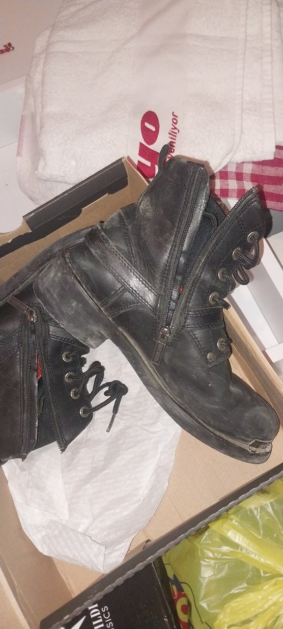 Kemer detaylı, yan fermuarlı siyah biker tarzı erkek botlarıdır. Dantel ve metal halkalarla sağlam, desen içermeyen tasarıma sahiptir. tabanligi deforme olduğu icin degistirildi
