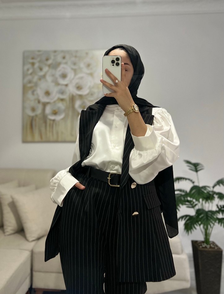 Kemer Detaylı Siyah çizgili Mini Blazer Pantolon Takım