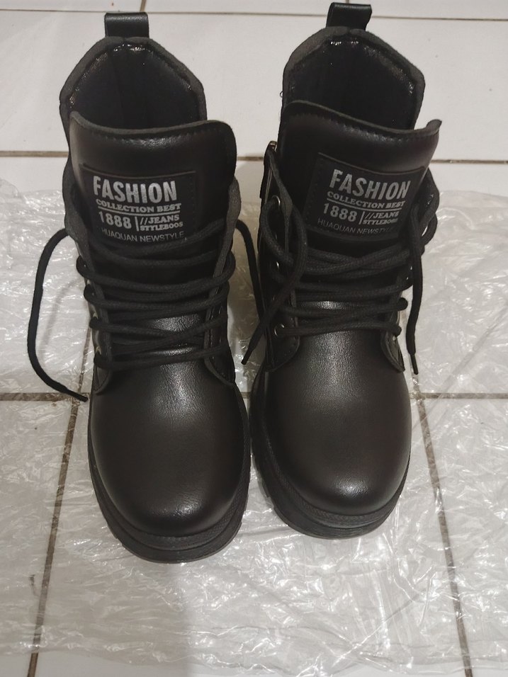 Sokak tarzı siyah çocuk botları, kemerli ve baskılı detaylıdır. Kauçuk malzemeden üretilmiştir, günlük kullanıma uygundur 31 numara