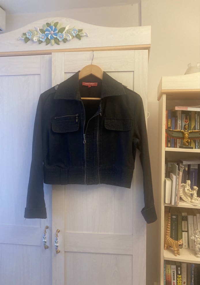 Kemerli bel ve uzun kollu, siyah denimden yapılmış, normal boyda ve yakalı, sokak stili için uygun, günlük kullanıma uygun kadın ceketi. Vekem marka keten ceket boyu 45cm iki kol arası 50 cm