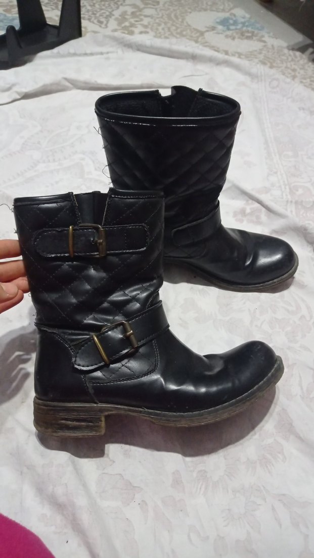 Kemer detaylı, siyah deri biker botlar, blok topuklu ve üst kısmında kapitone deseniyle grunge punk tarzını yansıtıyor. Günlük kullanıma uygun.