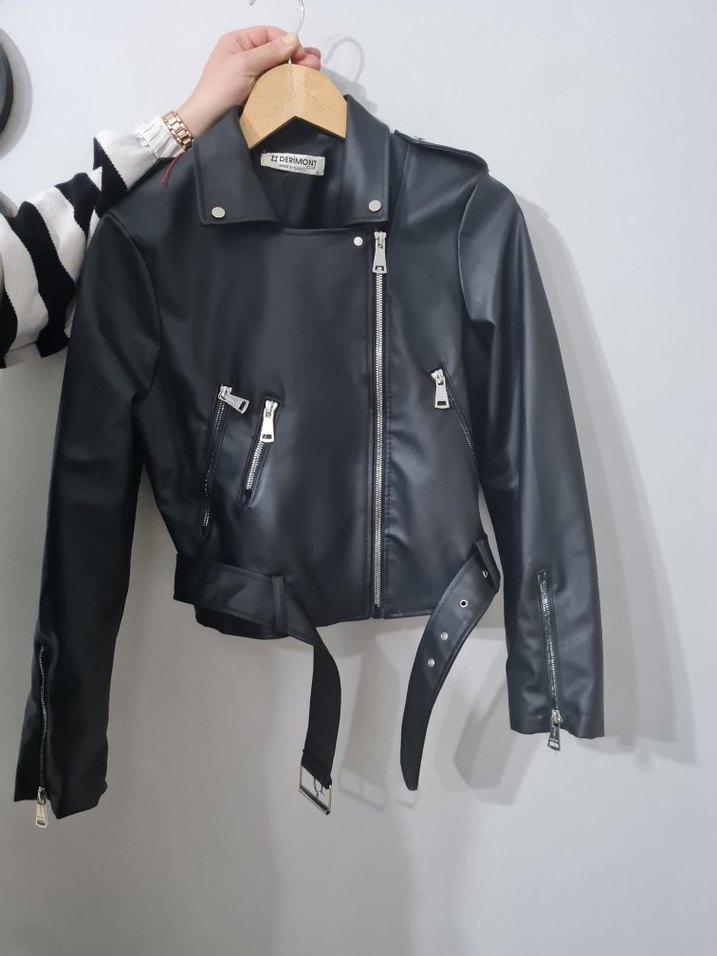 Kemer detaylı, kısa kesim siyah deri ceket, keskin yakası ve sıkı kesimiyle rock punk tarzını yansıtıyor. Derimont markadır. Küçük geldiği için hiç kullanılmadı. Fotolarda bellidir zaten. Ölçüleri fotolarda mevcuttur inceleyebilirsiniz.