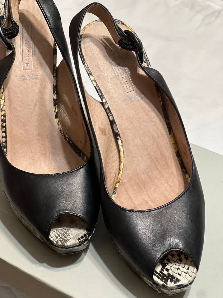 Yılan desenli açık burun ve kemerli siyah deri dolgu topuklu ayakkabılar. Romantik akşamlar için çağdaş tarzda.