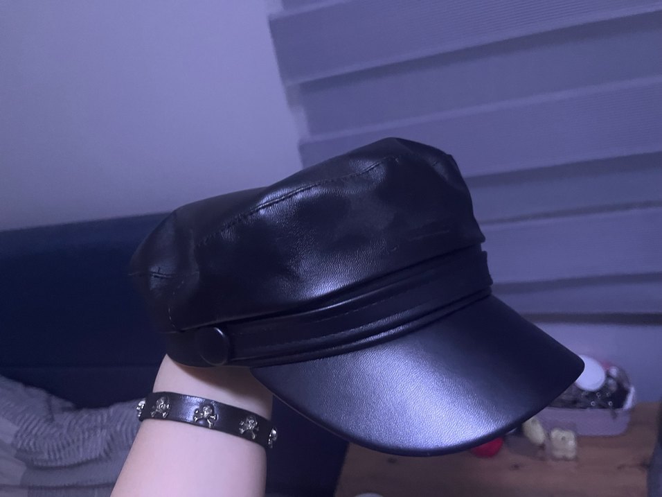 Kemer detaylı siyah deri kadın şapka, gotik ve rock punk tarzını yansıtıyor. Yapılı siperliği ve pürüzsüz yüzeyi bulunur.