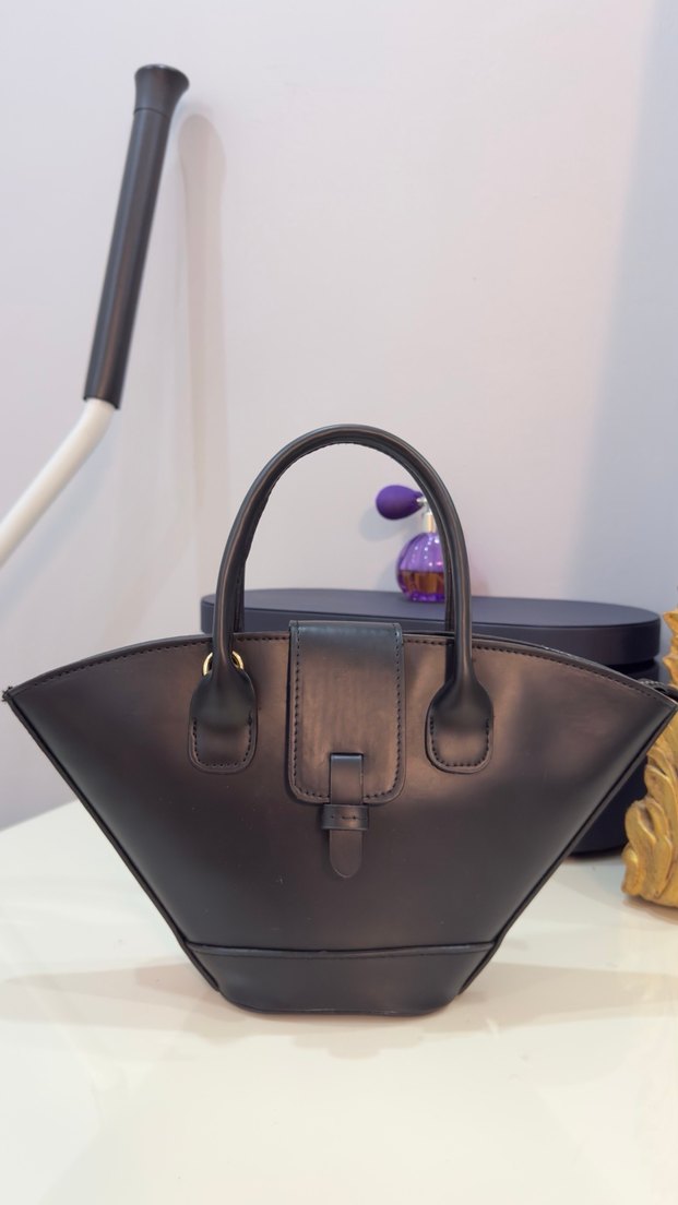 Kemer detaylı, siyah deri kadın çantası, çağdaş ve Paris esintili tasarımıyla dikkat çekiyor.