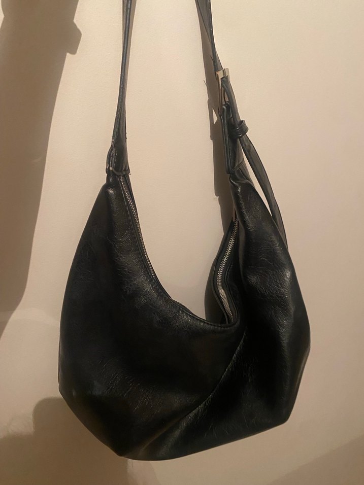Siyah deri kadın çanta, kemerli askısı ve minimalist tasarımıyla dikkat çeker. Koyu renk ve desensiz yapısıyla goth ve avant-garde tarzlara uygundur.