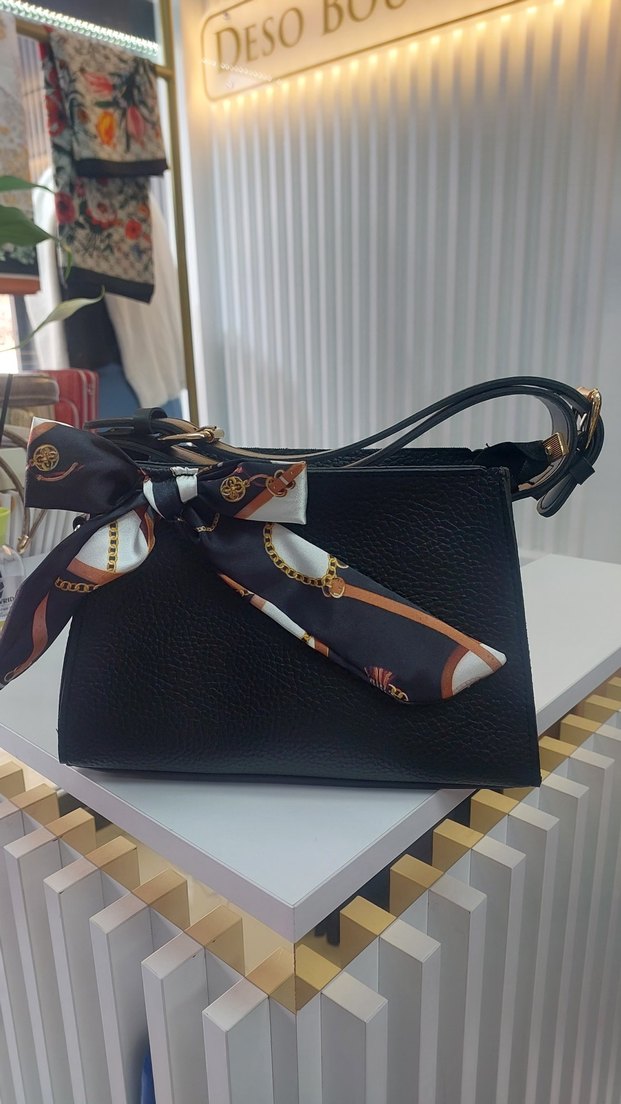 Kemer detaylı, baskılı fular süslemeli siyah deri çanta, klasik şıklık ve sokak stilini günlük kullanıma sunar.