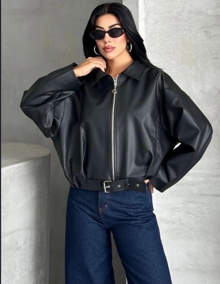 Kemer detaylı, yakalı ve uzun kollu siyah deri ceket. Rahat ve bol kesimiyle günlük kullanıma uygundur. Önü fermuarlıdır. Sıfır etiketli üründür geri iade yoktur.
