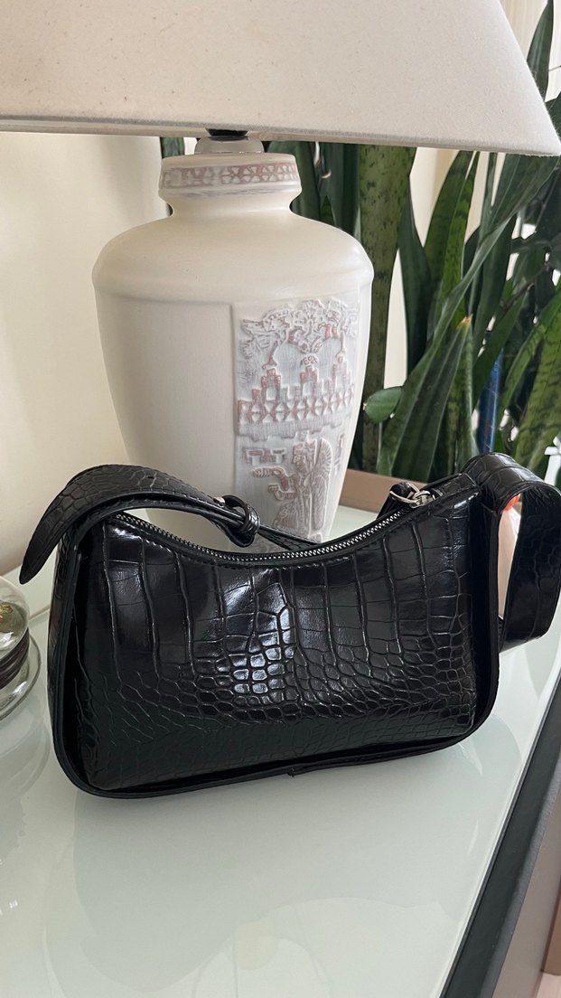 Kemer Detaylı Siyah Deri Yılan Desenli Çanta