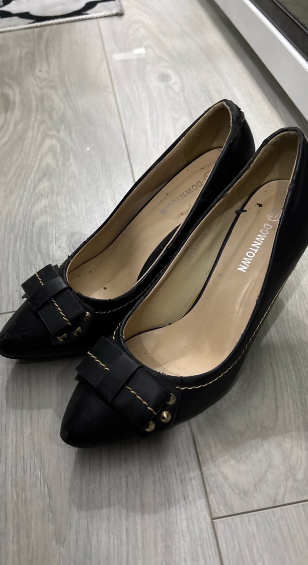 Kemer detaylı, siyah dolgu topuklu stiletto. Düz yüzeyli ve ofis kullanımı için uygun. İç kısmında 'DOWNTOWN' yazısı bulunur.