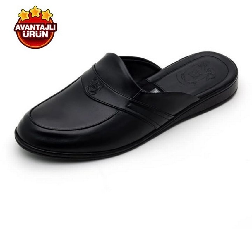 Kemer detaylı, desensiz siyah erkek ev terliği. Klasik tarzda ve rahat kullanıma uygun.