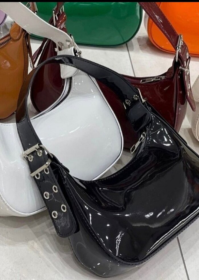 Kemer detaylı, parlak yüzeyli siyah gotik deri çanta, baskılı desene sahip, günlük kullanıma uygun. Cesur tarz.