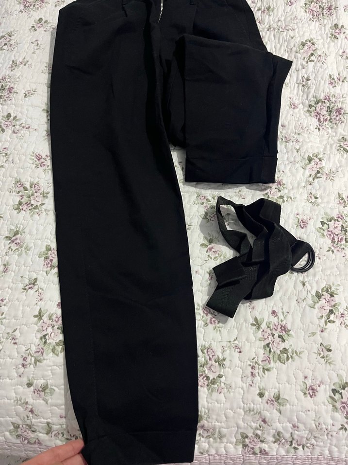 Kemer detaylı, midi boy, siyah gotik tarzda kadın kumaş pantolon.