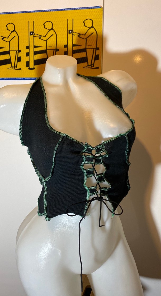Kemer detaylı, bağcıklı ön kısmı olan siyah, halter yaka, dar kesim gotik mini büstiyer. ters dikiş uzun kolları ekstra mevcut