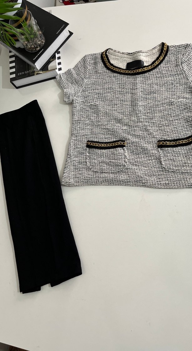 Kadınlar için uzun siyah etek ve kısa kollu, yuvarlak yakalı gri üstten oluşan takım elbise. Kemer ve zincir detaylı cepler, sentetik kumaş, ofis için uygundur.