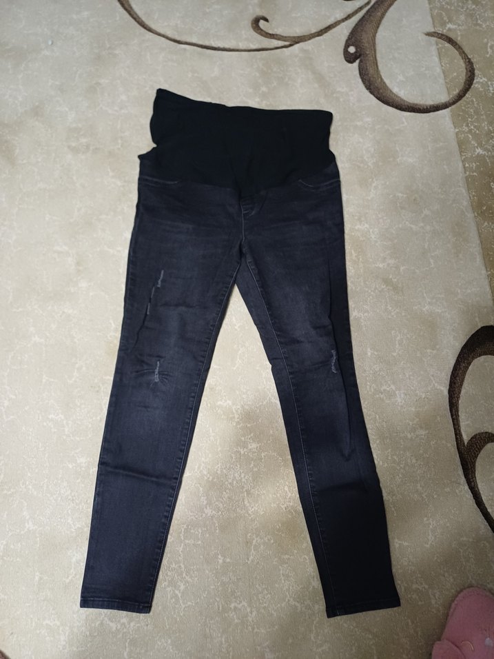 Siyah renkte, kemer detaylı ve fitted kesim hamile kot pantolon. Denim kumaştan yapılmış, günlük ve sokak stiline uygun normal boyda pantolon.