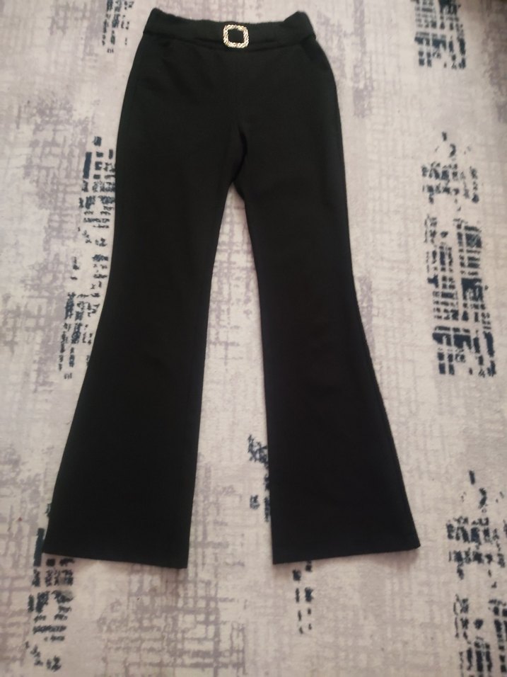 Kemer detaylı, parlak tokalı siyah kadın kumaş pantolon. Düz, desen içermeyen tasarımı ve normal midi boyu ile ofis şıklığı sağlar. Rahat ve şık sentetik kumaştan üretilmiştir.