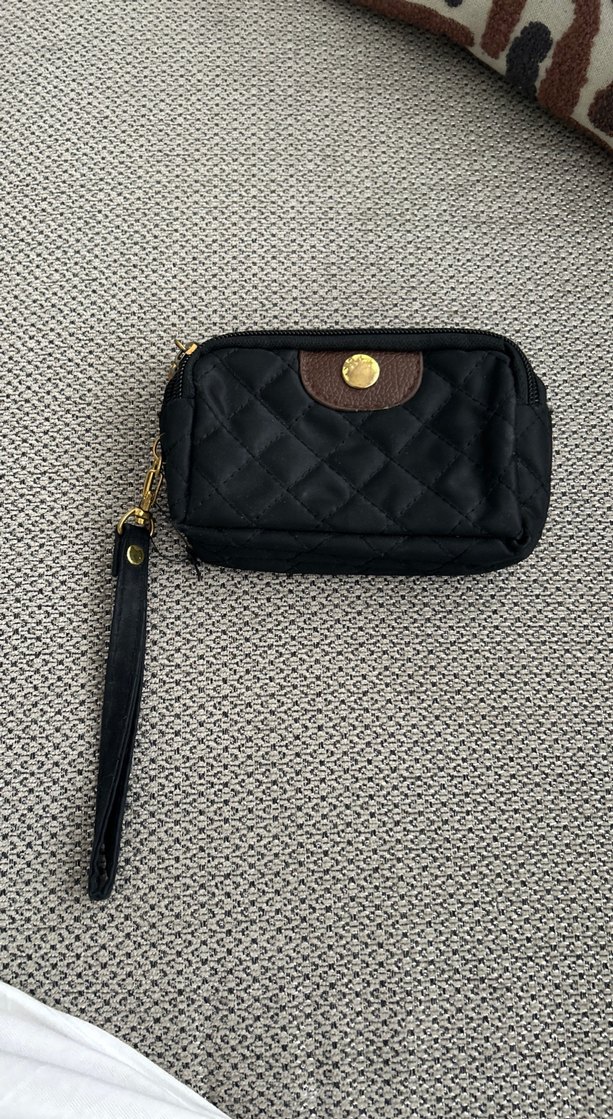 Suni kumaştan yapılmış, kapitone detaylı siyah kadın cüzdan. Kapitone desenli ve bilek askılı, günlük kullanıma uygun.