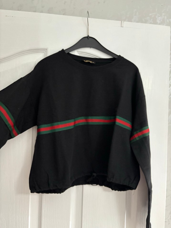 Uzun kollu, siyah renk sweatshirt. Ön kısmında kırmızı ve yeşil detaylar bulunmaktadır. Altı büzgülü