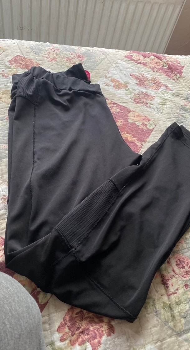 Siyah, kemerli ve midi boy kadın tayt, yumuşak sentetik kumaştan, sokak modasına uygun.