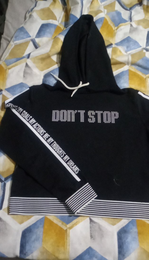 Kemerli ve baskılı 'DONT STOP' yazılı, uzun kollu siyah kapüşonlu sweatshirt. Çizgili manşet ve etek ucu detaylarıyla sportif şıklık sunar.