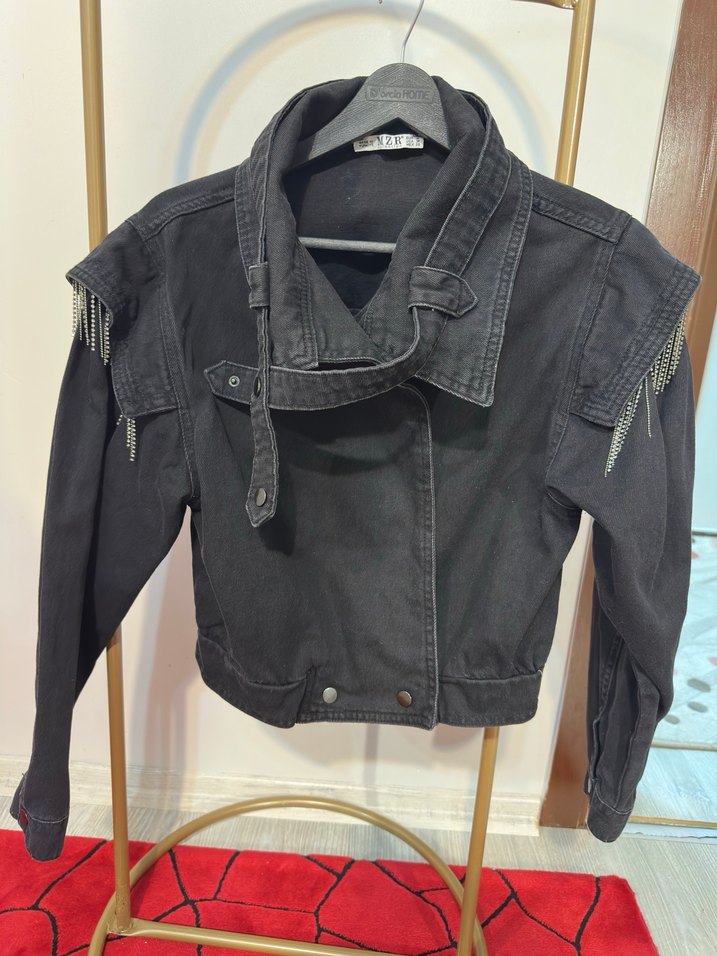 Kemer detaylı, kısa siyah denim ceket. Geniş kesim ve yakası notched lapel. Omuzlardaki zincir aksesuarlar dikkat çekiyor. Günlük kullanıma uygun.