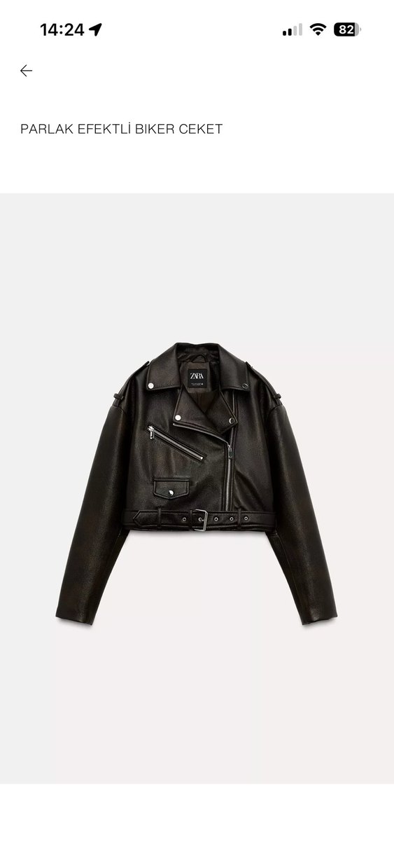 Kemerli, siyah kısa deri biker ceket, uzun kollu ve keskin yakalıdır. Günlük kullanıma uygun, rahat kesim sunar.