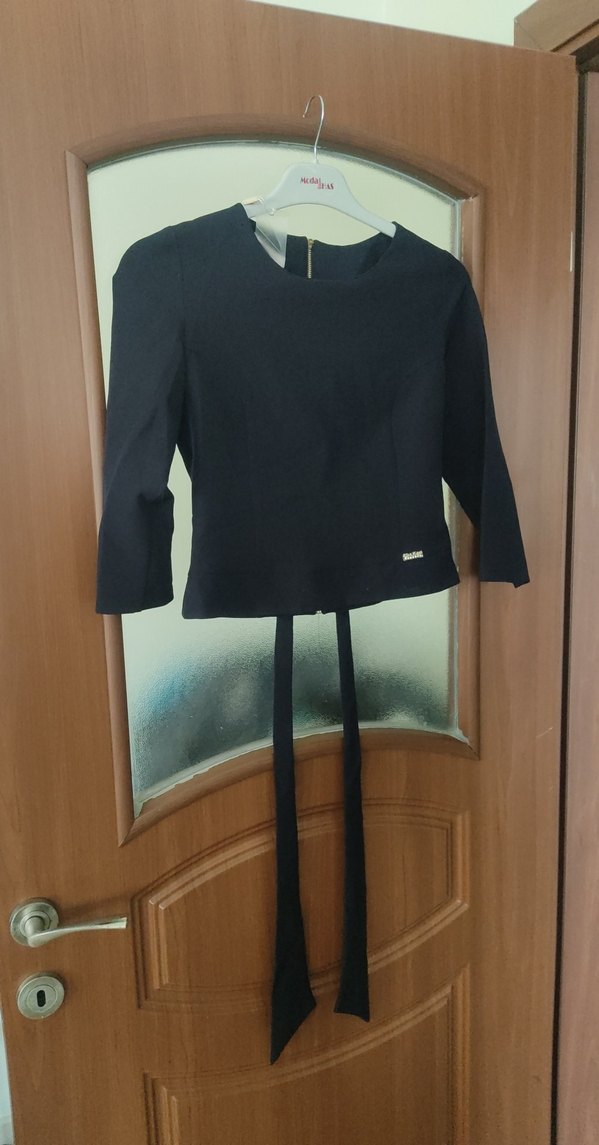 Kızlar için kemer detaylı, yuvarlak yakalı, uzun kollu siyah bolero. Pürüzsüz sentetik kumaştan üretilmiştir.