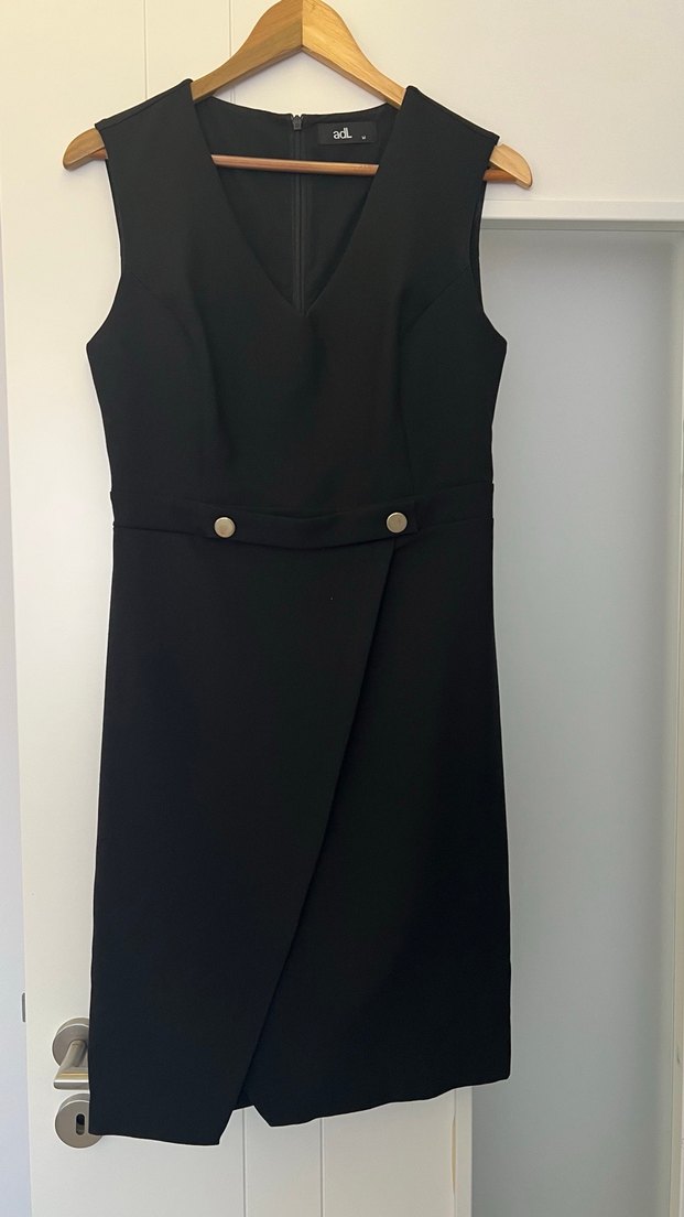 Kolsuz, kemerli ve düğmeli detaylı önü yırtmajlı siyah midi elbise, ofis için klasik ve şık bir görünüm sunar.