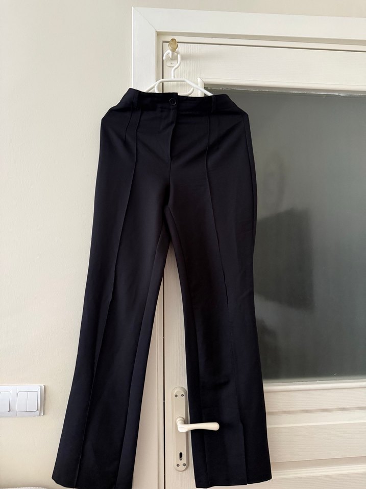 Kemerli bel, normal boy ve düz kesime sahip siyah kumaş kadın pantolon. Ofis için klasik ve desen içermeyen tasarım.