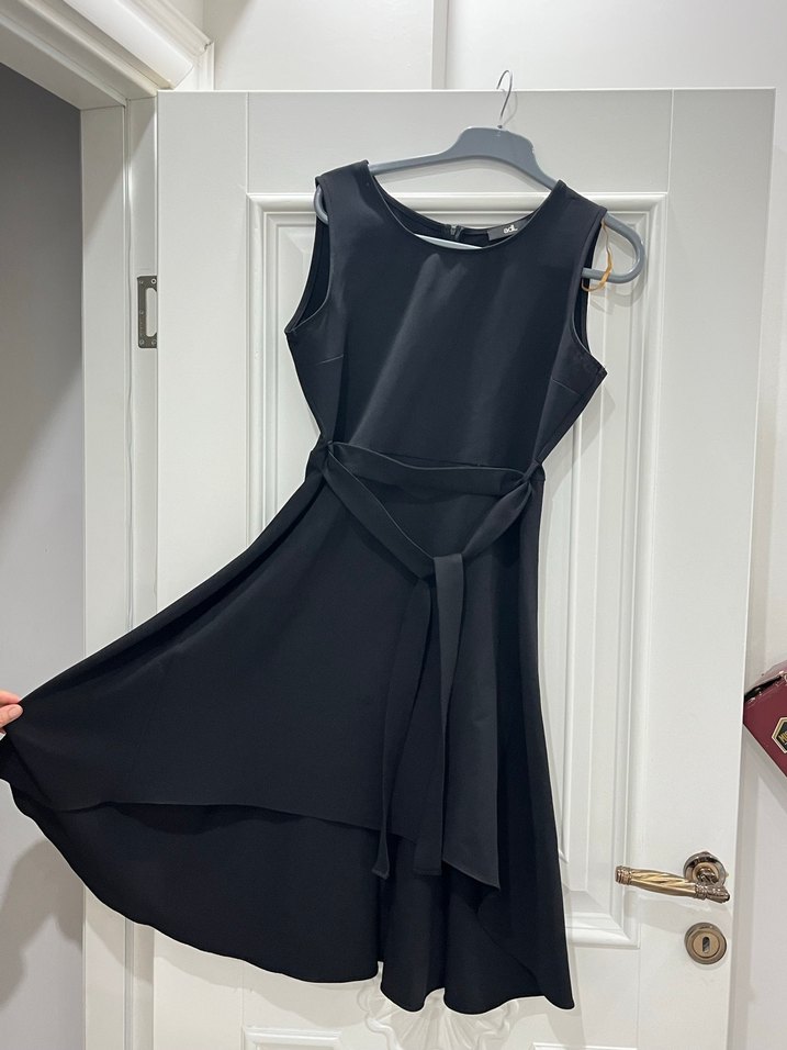 adL markalı, kemer detaylı, fitted siyah midi elbise, klasik zarafet ve gotik stilin birleşimi.