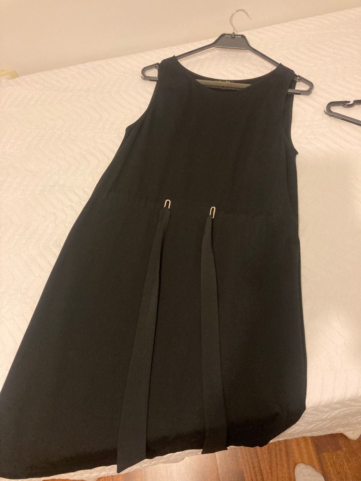 Kolsuz, halter yakalı siyah midi elbise, kemer detayıyla minimalist goth tarzını yansıtıyor. Rahat ve salaş kesim.