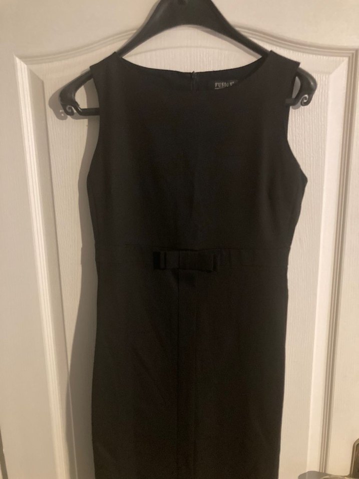 Kemerli, vücuda oturan siyah midi elbise, klasik yuvarlak yakalı ve kolsuz tasarıma sahip. Ofis ve şık etkinlikler için uygun.