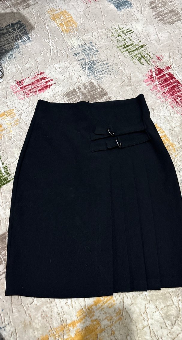 Düz siyah midi etek, kemerli detay ve hafif pilelerle. Düzgün sentetik kumaştan, ofis kullanımı için uygun.