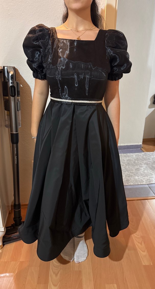 Kemerli, kısa balon kollu, tek renk siyah midi elbise.