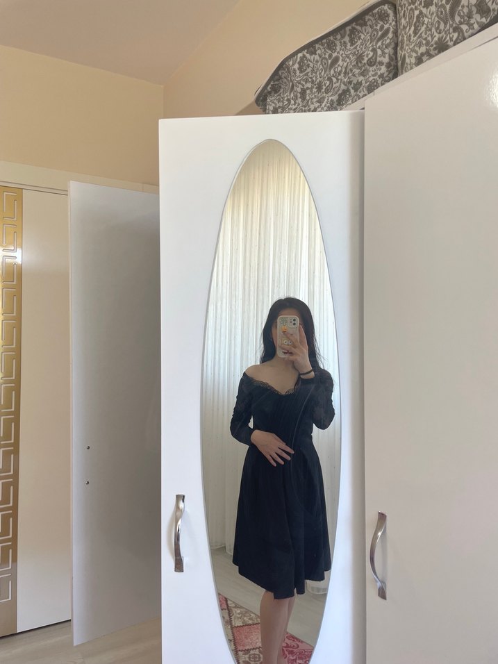 Kemer detaylı, dantelli kayık yaka ve uzun kollu siyah midi elbise, klasik gotik tarzda ve romantik buluşmalar için uygun.